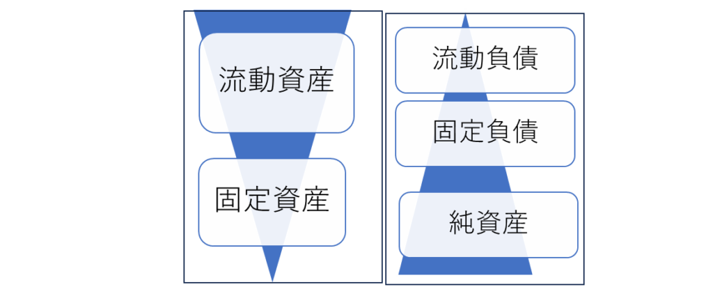右側(負債+純資産)が三角形になる貸借対照表です。